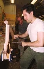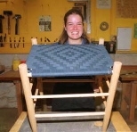 Ken Stone, director of the MIT Hobby Shop, has been teaching students how to make post and rung stools this summer, using only hand tools. At top left, he holds a froe, as mechanical engineering graduate student Aimee Angel brings the froe club down onto the green piece of red oak she is riving (the term for controlled splitting). Below, Ms. Angel proudly displays her finished stool. The seat is hand woven of strapping, and contains wood shavings saved from the early stages of building the piece. The Hobby Shop is open to members of the MIT community.