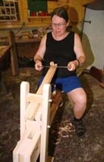Below left, Martha Adams, retired from the math department, uses a drawknife to shave wood on a shaving horse. At right, a Hobby Shop participant drills mortice holes in posts, to fit the tenons of rungs.