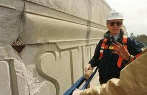 Project manager Ron Catella of Facilities (lower photo) examines damage to the facade below the Great Dome. He did a close-up inspection with the help of one of the largest cranes on the East Coast (top photo), which was brought to the crosswalk at 77 Massachusetts Avenue last Thursday. The diamond-shaped object in the lower photo is an iron anchor that rusted and swelled, causing the stone in front to pop off. Workers will cut a matching piece of limestone and install it sometime this summer.