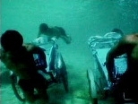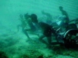 Shot in Vietnam's Indochina Sea, "Memorial Project Nha Trang, Vietnam Towards the Complex--For the Courageous, the Curious and the Cowards" (2001) depicts a number of young men struggling to propel cyclos underwater across the rock-strewn and sandy ocean floor. Working in teams, they pull, push and pedal the passengerless vehicles. Periodically and in ever-shortening cycles, they rush up to the surface for air or risk drowning. Finally, the drivers abandon their cyclos and swim together toward an underwater "city" of tents made from white netting strung between boulders. The clear blue water, sunlight dappling the ocean floor, and gentle flute music composed by Quoc Bao and Nguyen-Hatsushiba provide stark contrast in this metaphor for an endangered way of life.
