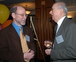 The Quarter Century Club welcomed 146 new members (those who've worked at MIT for 25 years or more) at a Faculty Club luncheon on April 1. Top photo: Gayle M. Gallagher (left), director of conference services, events and the Information Center, chats with Patricia Vargas, assistant director of the Technology and Development Program. Below: 2002 Nobel laureate Robert Horvitz (left), professor of biology, and QCC president Anthony P. French, professor emeritus of physics.