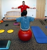 The Department of Athletics, Physical Education and Recreation celebrated the first anniversary of the Zesiger Athletic Center with a cake and demonstrations. Top, spinning, from left are Peter Neirinckx of the Draper Laboratories, senior Allison Lewis, instructor Jill Balzano and graduate student Sara Larsen. Below: Zesiger fitness coordinator Shane Elder (in red) shows administrative assistant Glenn Ketterle how to use a stability ball.