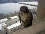 All politics aside, the MIT campus is seemingly full of hawks these days. The red-tailed hawk fledgling (top) departed its nest for the first time on May 26, taking a solo flight to the bike racks in front of the Stratton Student Center and eventually back to its nest, encouraged by parental calls. People at MIT and elsewhere have been following the progress of the bird and its sibling in their campus nest since April via Hawkcam, a continuous feed of video images on MIT cable TV and the Academic Media Production Services web site at http://web.mit.edu/amps/spotlight/hawkcam.html. Below, another hawk takes a rest on the 17th-floor windowsill of Professor Peter Stone's office, as spotted by occupants of Building 54 in April.