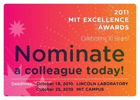 Nominations for this year’s awards are due Oct. 25 for campus staff, Oct. 18 for Lincoln Laboratory employees. Now in its 10th year, the Excellence Awards recognize exceptional accomplishments by support, service, sponsored research, administrative and other academic staff (they’re not intended to recognize teaching and research). Individuals receive $2,000 prizes, and each team shares up to $10,000.