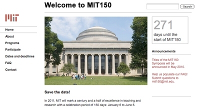 The MIT150 program is under development and this phase I site will be updated as information becomes available. The committee encourages departments, labs, centers, student groups, and other campus organizations to begin thinking about participating in the Sesquicentennial Open House, and welcomes community input in building the FAQ. The fully featured MIT150 web site will be revealed in January 2011. In the meantime, please contact the committee with questions and ideas.
