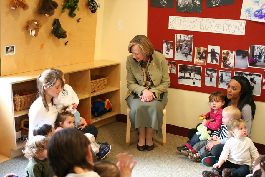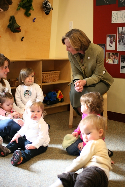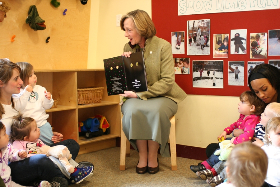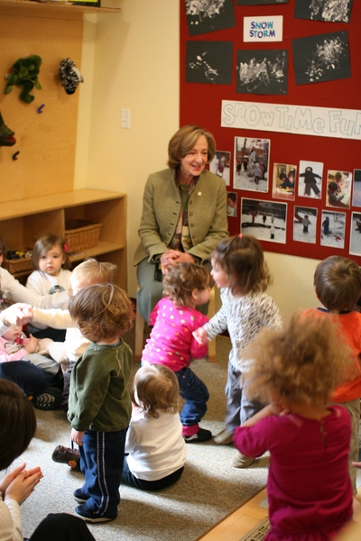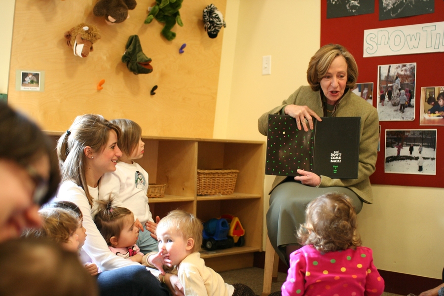 President Hockfield toured the center and shared a story with children from the toddler classrooms — Go Away Big Green Monster, a book that reveals a monster and makes it disappear page-by-page. She also told them about MIT's 150th birthday, prompting one toddler to ask, “Will there be candles?” The trip finished with a recital of the ABCs.