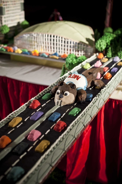 Upon entering Killian Court, guests found festive columns of red light; an array of tables, chairs, dessert towers and drink-serving stations; and even a dance floor. Many gravitated toward the cake, a replica of the campus complete with architectural landmarks (the Great Dome, Simmons Hall, Kresge Auditorium, the Green Building, the Ray and Maria Stata Center and the new MIT Sloan School of Management building among them), cars along Memorial Drive, Tim the Beaver crawling across the Massachusetts Avenue bridge and a Charles River of blue and white cupcakes spelling “MIT 150.”
