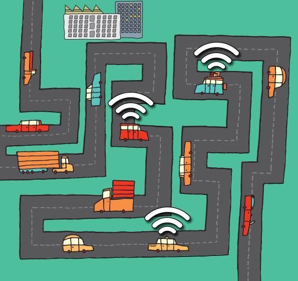 Two Wi-Fi-equipped cars sitting at a stoplight could exchange information free of charge, but if they wanted to send that information to the Internet, they’d probably have to use a paid service such as the cell network or a satellite system. At the ACM SIGACT-SIGOPS Symposium on Principles of Distributed Computing, taking place this month in Portugal, researchers from MIT, Georgetown University and the National University of Singapore (NUS) will present a new algorithm that would allow Wi-Fi-connected cars to share their Internet connections. “In this setting, we’re assuming that Wi-Fi is cheap, but 3G is expensive,” says Alejandro Cornejo, a graduate student in electrical engineering and computer science at MIT and lead author on the paper.