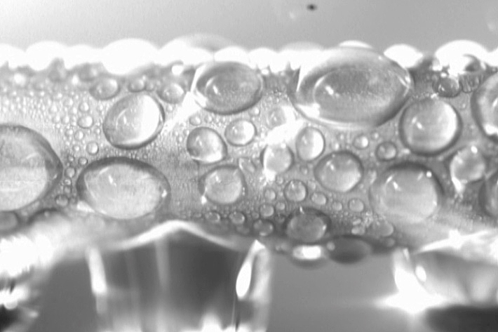 On a copper pipe coated with a hydrophobic material, but without the layer of oil, few droplets form, and they stay on the surface longer and grow much larger before falling away. Video: Nenad Miljkovic and Rong Xiao