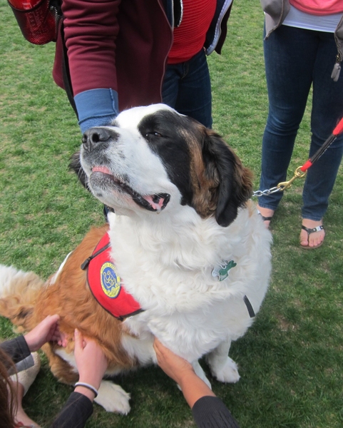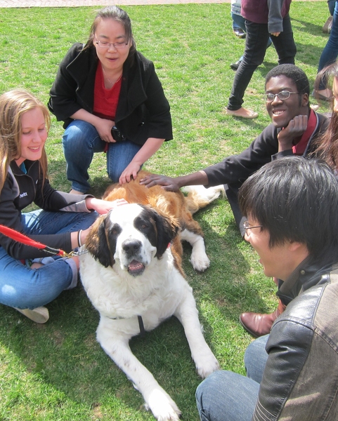 The dogs have visited previously to relive stress during finals week, but this time MIT put out a call asking for therapy dogs to lend emotional support. Dozens of handlers and their dogs responded, and for three hours the Kresge Lawn was crowded with fuzzy, four-legged therapists that ranged in size from Murphy, a tiny pug, to Savannah and Sidney, sister Saint Bernards. The MIT Parents Association was also on hand offering cookies, milk, ice cream and even hugs to students who needed one.