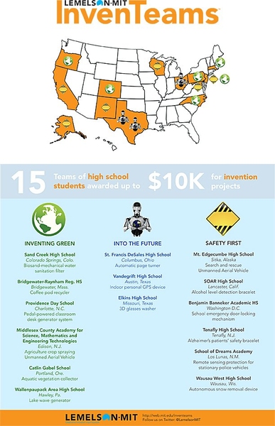 The Lemelson-MIT Program recently awarded 15 teams of high school students up to $10,000 each in grant funding as part of its InvenTeam initiative, which encourages students to invent technological solutions to real-world problems.