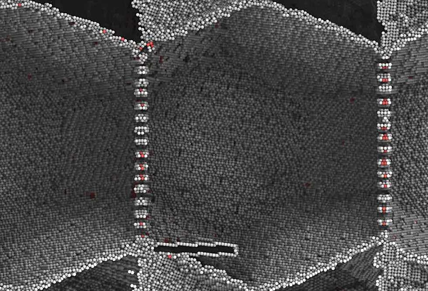 The very idea that crystal grain boundaries could migrate within a solid metal has been extensively studied within the last decade, Demkowicz says. Self-healing, however, occurs only across a certain kind of boundary, he explains — one that extends partway into a grain, but not all the way through it. This creates a type of defect is known as a “disclination.”