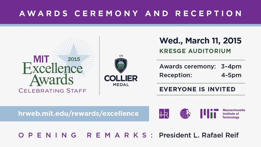 The 2015 MIT Excellence Awards and Collier Medal Ceremony will take place on Wednesday, March 11, at 3 p.m. in the Kresge Auditorium (Building W16), with a reception to follow.