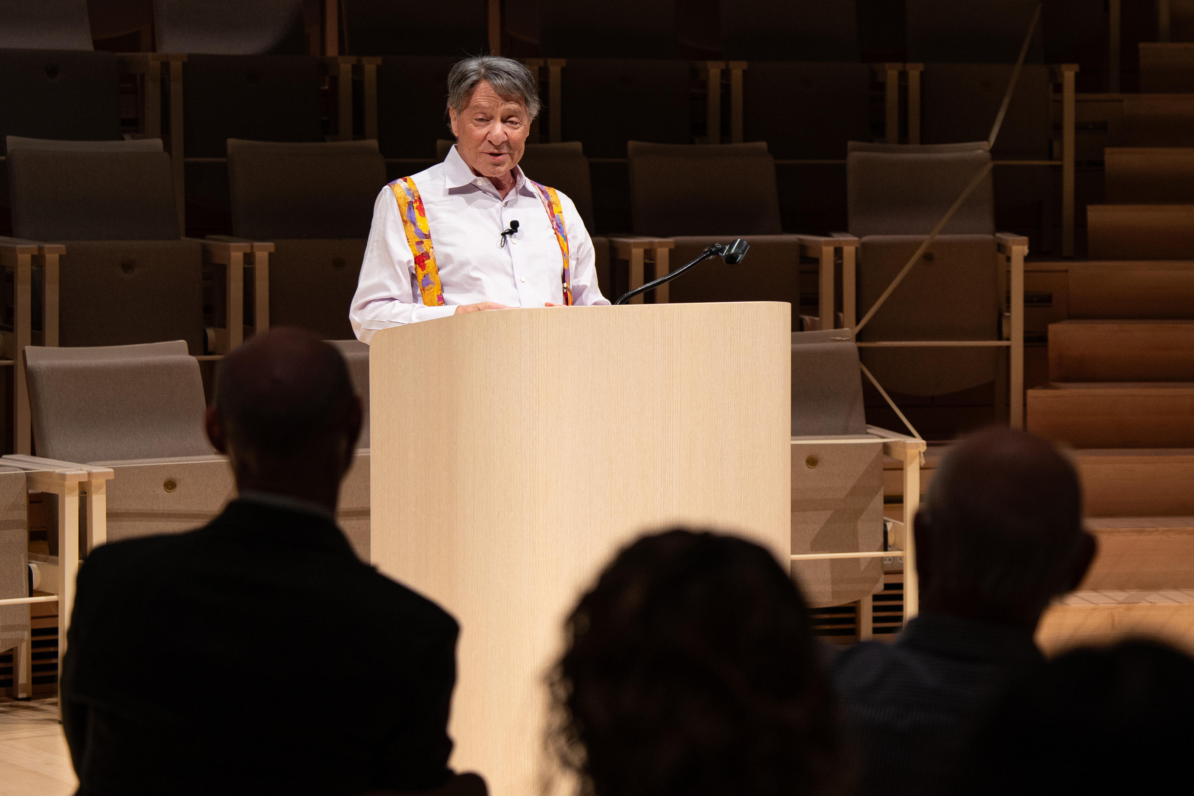 The initial segment of Kurzweil’s lecture was autobiographical in focus, reflecting on his family and early years. The families of both of Kurzweil’s parents fled the Nazis in Europe, seeking refuge in the U.S., with the belief that people could create a brighter future for themselves.
