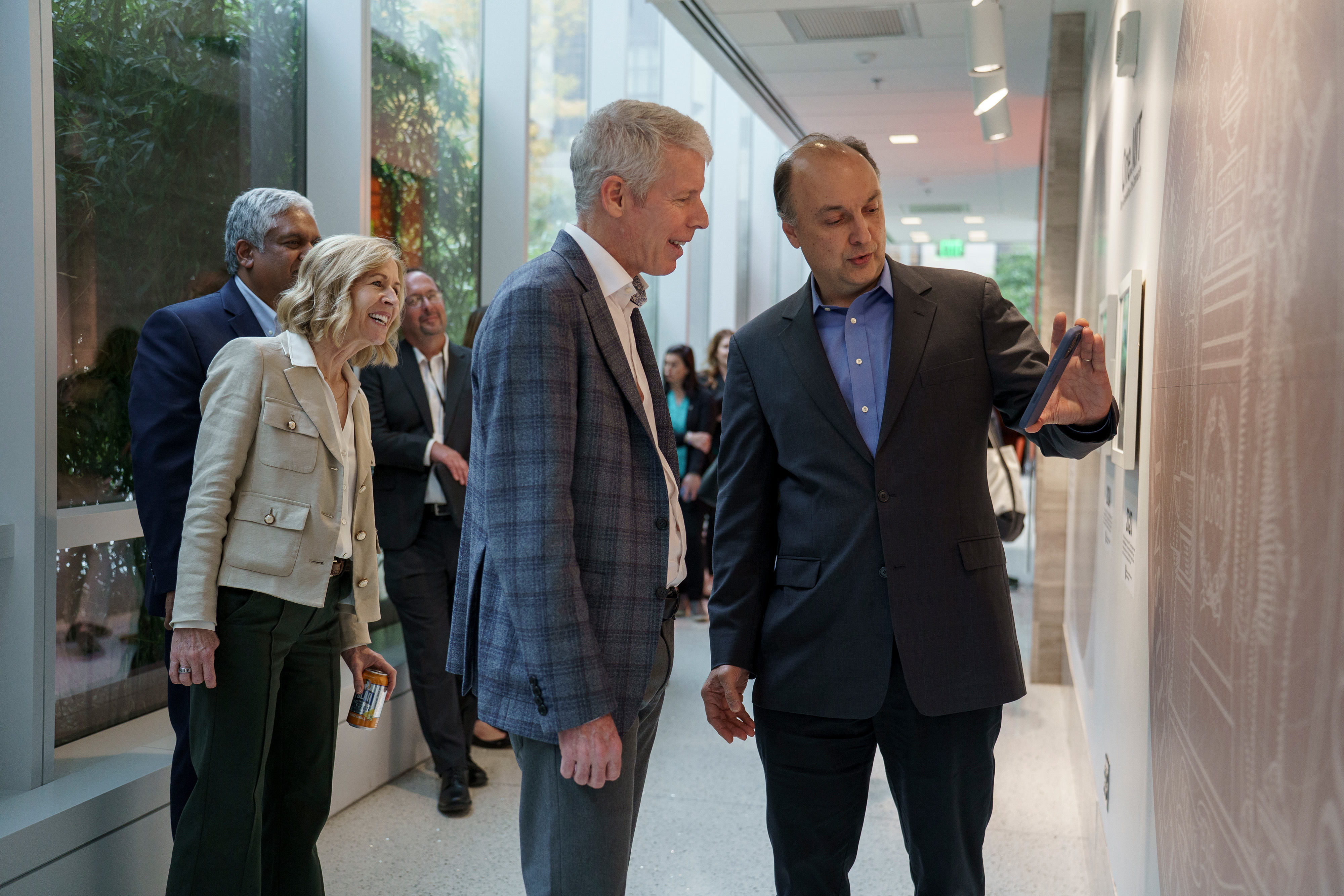 On a different note, in an MIT.nano hallway, Bulović showed Wright the One.MIT mosaics, which contain the names of all MIT students and employees past and present — well over 300,000 in all. First etched on a 6-inch wafer, the mosaics are a visual demonstration of the power of nanotechnology — and a searchable display, so Bulović located Wright’s name, which is printed near the chin of one of the figures on the MIT seal.