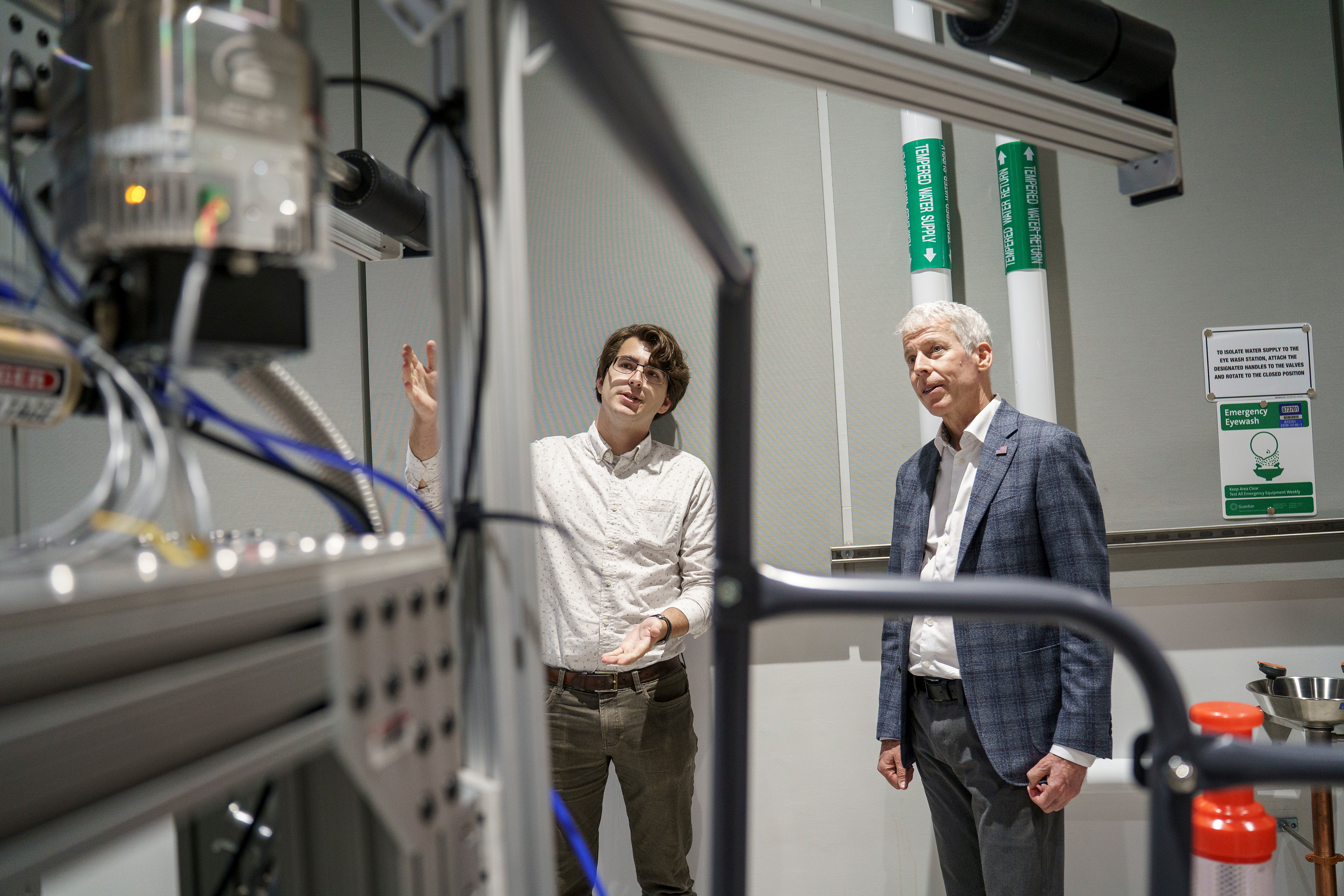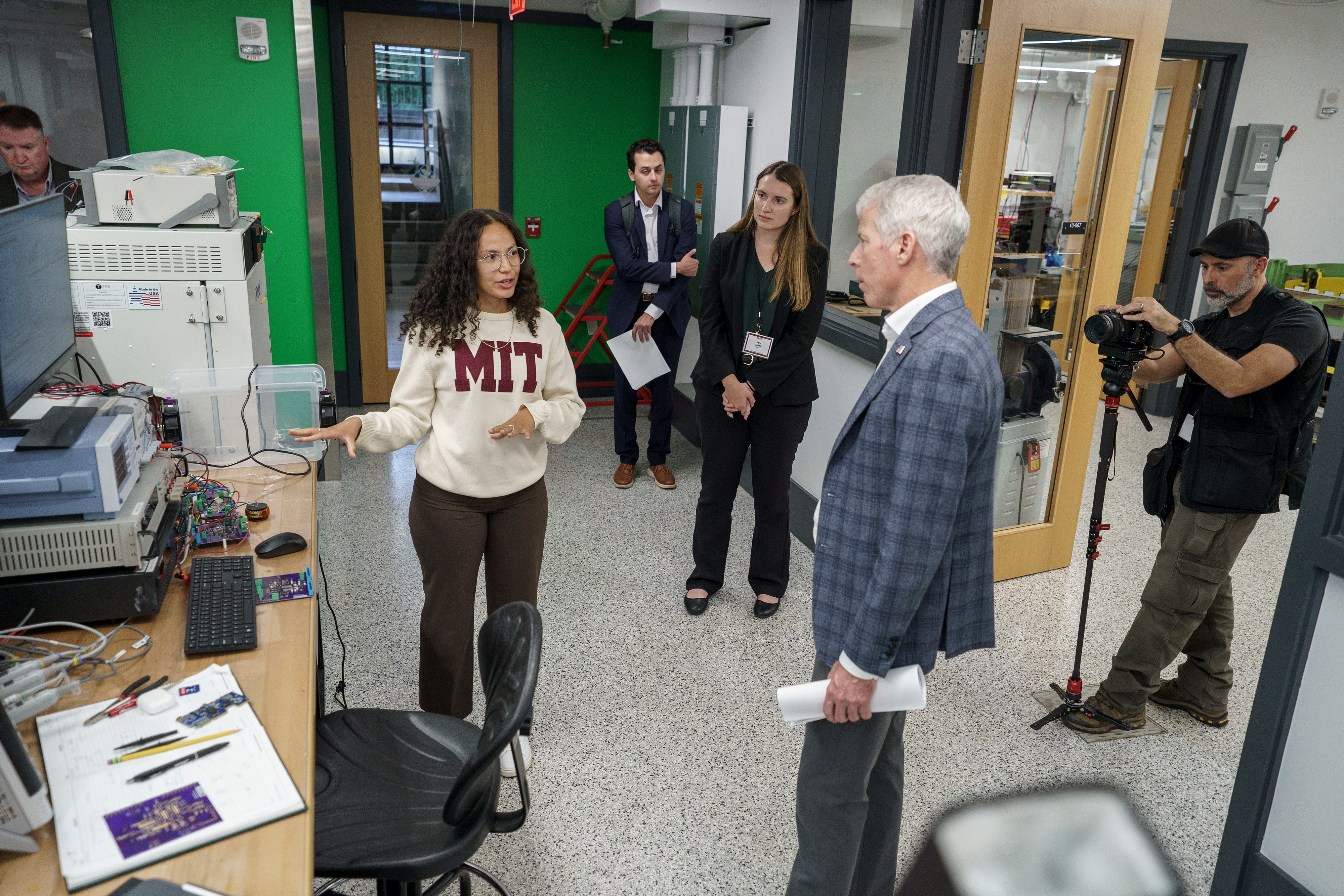 At the lab, Wright met with David Perreault, the Ford Foundation Professor of Engineering; Steven Leeb, the Emanuel Landsman Professor and a specialist in power systems; and Sam Coday, the Emanuel E. Landsman Career Development Chair and an assistant professor in the Department of Electrical Engineering and Computer Science. A half-dozen MIT graduate students gave Wright demos of their research projects, all involving energy-generation innovations. Wright readily engaged with all the graduate students about the technologies and the parameters of the devices, and asked the students about their own careers.