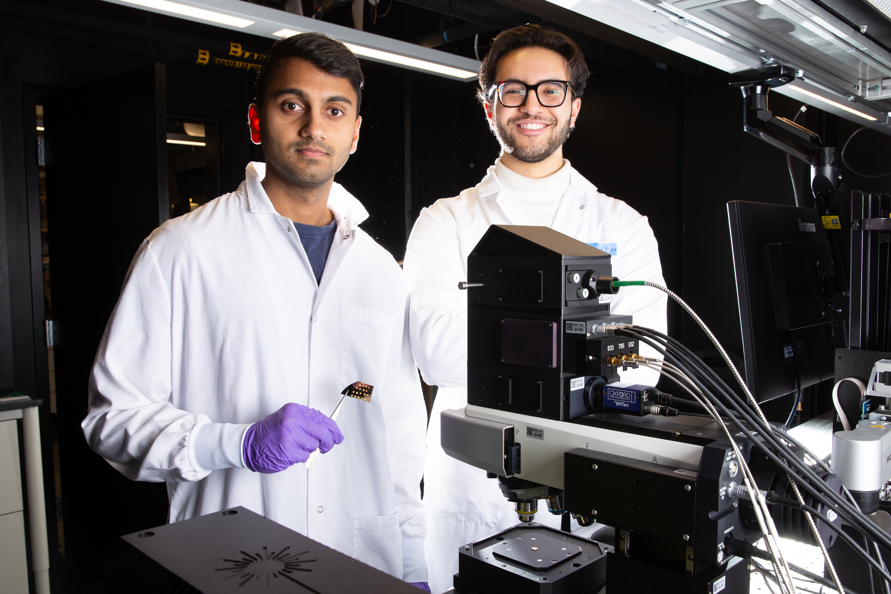 Aditya Garg and Seleem Badawy in lab with microscope. Garg holds a tiny device with tweezers.